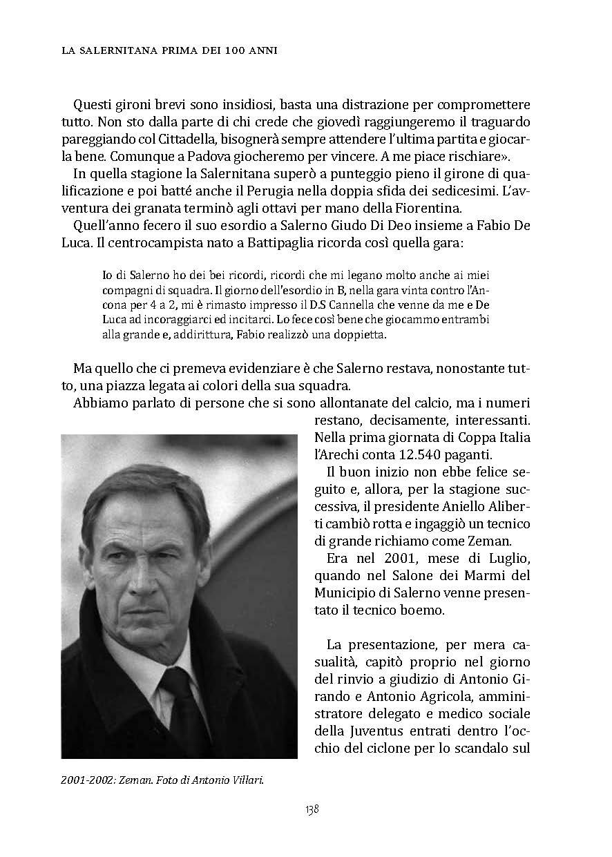 La Salernitana prima dei 100 anni vuole essere un racconto dei fatti attraverso la voce dei protagonisti ed un’attenta ricerca storica di articoli apparsi sui più importanti quotidiani nazionali e locali, che hanno completato o approfondito il percorso di ricerca del volume. Non mancano ricordi ed emozioni vissute in prima persona dall’autore e interviste esclusive a calciatori che hanno fatto la storia della Salernitana come Pierino Prati, Mario Sestili, Delio Rossi, Roberto Breda, David Di Michele e tanti altri ancora. Tra le pagine raccontate dall’autore, oltre alla storica promozione in serie A e al dramma dei tifosi deceduti nel rogo del treno di ritorno da Piacenza, anche la ricostruzione storica della vittoria della Coppa Berretti, unico trofeo nazionale vinto dalla Salernitana prima del fallimento della presidenza Lombardi e dell’avvento dell’era Lotito-Mezzaroma.